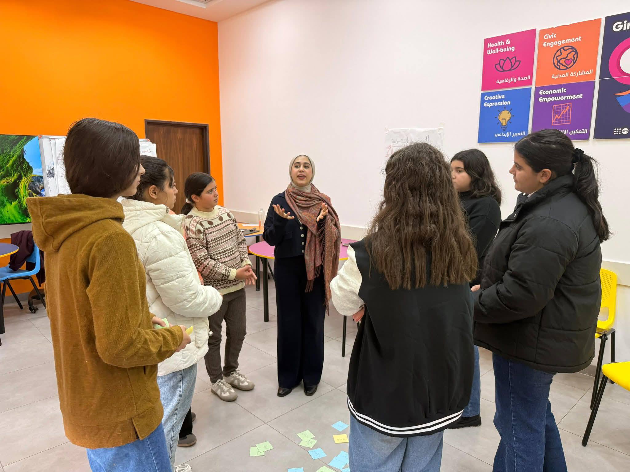 Perched in the heart of Nablus, Jabal Al-Nar Center provides a dynamic and inclusive setting for adolescent girls from both urban and surrounding communities. The center currently engages 75 girls aged 12–17, divided into three active learning groups, who participate in a series of interactive sessions focusing on holistic health, leadership, and self-expression.
